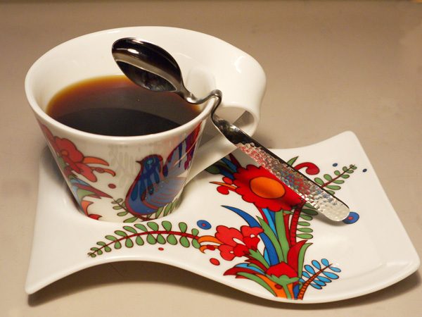 ふと見ると、そのコーヒーカップが店内の壁に陳列されている。店員さんに、カップの販売もやっているのかと聞いてみると、このカップ、ブランドもののカップだそうで、大丸の9階に売っているとのこと。あぁ、行きましたとも、9階へ。打ち合わせ終了後、速攻で9階まで上がり、さっそく購入してまいりました。喫茶店で使用していたカップは白無地でございましたが、ワタクシが購入したのは同じデザインでかわいらしい絵柄のもの。恋人でもいれば二個セットで購入するところでございますしょうが、あいにく今のワタクシは独り身。自分の分のひとセットだけ、購入したのでございます。