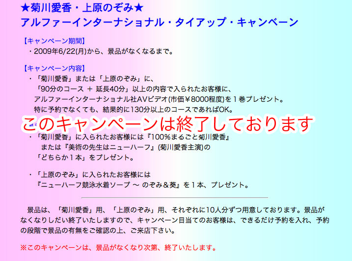 このたび、そのアルファーインターナショナルからタイアップの申し出がございまして、お客様に大サービスをすることになりました。「菊川愛香」「上原のぞみ」に「予約&延長付き」で入られたお客様に、彼女たちの出演AVビデオを一本(市価¥8,000程度)、プレゼントしちゃうということになりました。