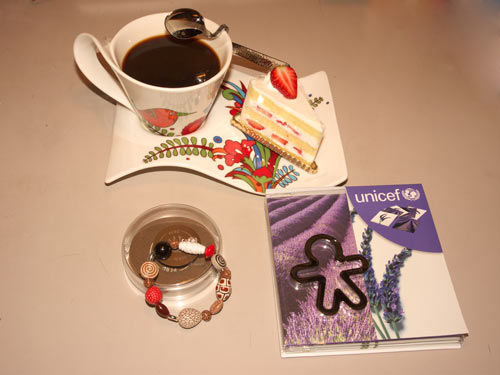 話はガラッと変わりますが、時々、ユニセフに募金をしております。それでユニセフのホームページをのぞいたりするのですが、ユニセフにも“グッズ”なるものが有るのを知り、さっそく注文してみたのでございます。ラベンダーの香り袋、子供の形をしたキーホルダー、ペルー製のビーズを使ったブレスレット。代金の50%が、ユニセフに募金されるシステムになっております。「UNICEF」のロゴマークの入ったものを身につけていると、ちょっとワクワクいたします。シャネルやヴィトンのマークにワクワクする人は多いのでしょうが、ワタクシにとっては「UNICEF」の文字マークが、それに値するようでございます。