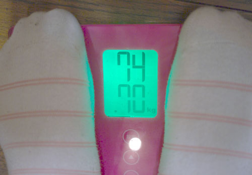 さて、そこで本日の体重公開でございます。ヘルスメーターに乗りまして、さぁ体重をカメラで撮影しようと思いましたら、カメラを持ったとたんに体重が増える。慌ててカメラを置くと、体重は元に戻るが撮影が出来ない。もうね、ヘルスメーターに乗ったまま、カメラを持ったり放したり、コントのようなことをしておりました。結局、従業員の一人にお願いして、ワタクシがメーターに乗っているところをパチリと撮ってもらったのでございます。そのような次第でございますので、毎回、ヘルスメーターの画像を乗せるのは難しいですが、いつでも必ず正直に体重をご報告することをお約束するのでございます。