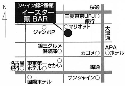 本日は、ワタクシの大先輩の方々のお店のご紹介をいたします。9/7に、「イースター 薫 BAR」というお店が、錦三丁目にオープンしております。本日はそのお店にご挨拶に伺ったのでございます。ここで、注意!! お店の名前の「薫 BAR」を見て、ワタクシを想像された人は大間違い。「薫 BAR」の薫とは、元ガラシャの薫ママのことでございます。
