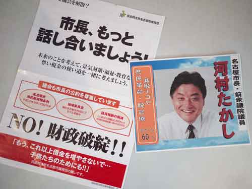 ということで、市議会リコールの署名運動も終わりました。両者の意地の張り合いみたいになっちゃってますが、今回のポイントは、名古屋市長、河村たけしさんのマスコミ利用の上手さでございますね。と同時に、市議会側がマスコミに全く慣れてない。ちょっとカメラを向けられただけで、怪訝な顔をしたり避けたりしてましたからねぇ。これと同じことが事業仕分けでも言えますよね。日本中に中継されている事業仕分けの場で、やはり蓮舫さんなんかはカメラ慣れしておりますので堂々としている。それに対して仕分けされる側ってのは、カメラや見学者を意識して緊張していらっしゃる方が多かった。東国原さんや橋本さんの例もありますし、これからはマスコミをいかに上手に利用できるかも、その政治的手腕のひとつとして重要なのかもですね。