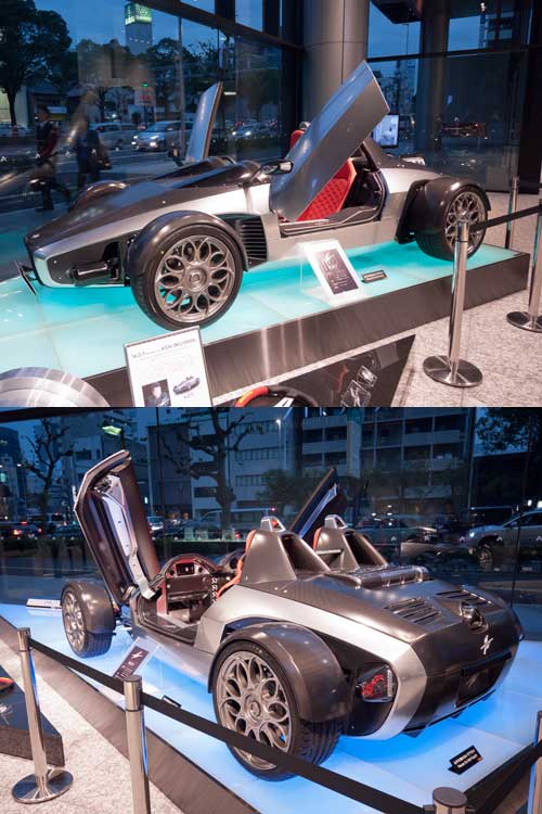 「現物を見ると」なんて申しましたが、実は、その“現物”が、すぐ近くに存在するのでございます。お店の近くに「ヤマザキマザック美術館」がございますが、その1階のショールームに展示してあったのを、少し前に発見いたしました。ショールームはガラス張りですので、外からでも十分見つけられます。場所は、地下鉄「新栄町」1番出口を出たところ。ショールームはビルの西側でございます。ちなみにショールームは入場無料(アンケート記入が必要)ですし、ガラス張りで外からでも十分鑑賞できるのでございます。地下鉄の1番出口を出た際には、チラッと思い出してみて下さいませ。日本刀とスポーツカー、その両者のデザインが“機能美”で結ばれているという事実、面白いのでございます。