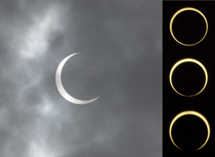 日食、見ましたよ、早起きして。写真を撮る気はなかったのですが、朝起きたらチョットテンションが上がってまして、バタバタとカメラの準備をして、屋上へ上がったのでございます。日食メガネは購入しておりましたが、カメラ用の減光フィルターはない。そこで、日食メガネをはさみで半分にブッた切りまして、左目部分は自分用、右目部分はカメラのレンズにセロテープで止め、撮影スタンバイOKでございます。
